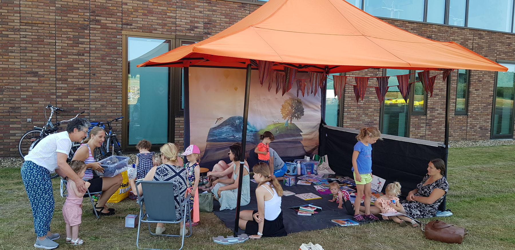 De voorleestent werd bemand door medewerkers en vrijwilligers van de Bibliotheek. Het was een gezellige drukte in de tent.