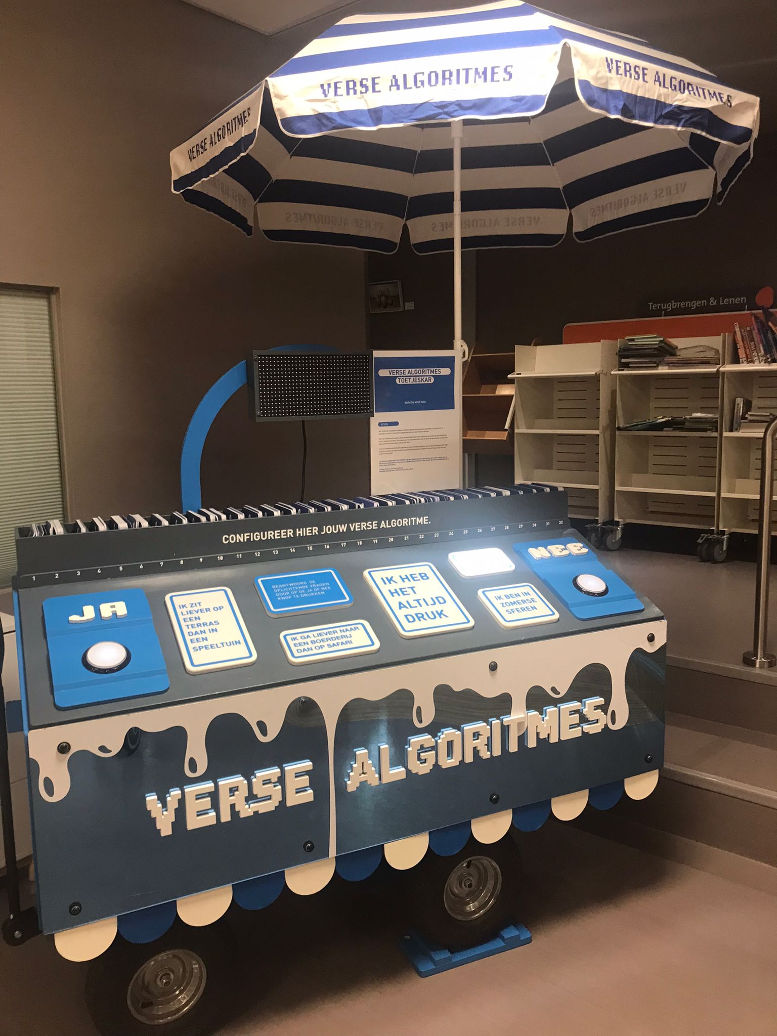 Vanaf december stond de Verse Algoritme Toetjeskar van Huis73 (Bibliotheek Den Bosch) in onze bibliotheek in Dalfsen. Bezoekers leerden op een speelse manier over algoritmes en kregen een toetjesrecept op maat.